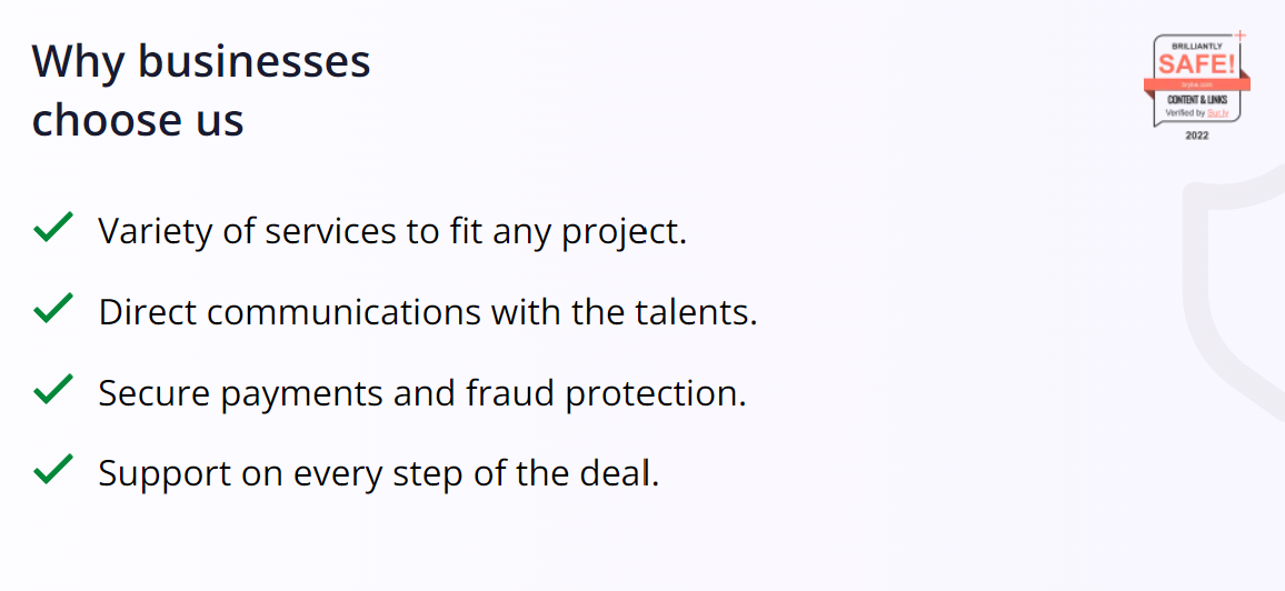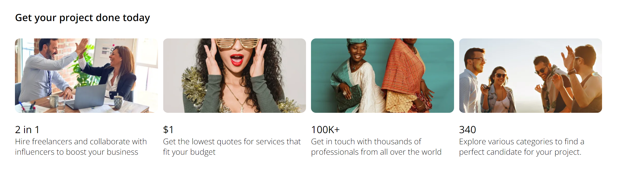 The entire process is unified at our Freelance Marketplace. By addressing all of your business needs for hiring professionals in one place, offering you multiple Freelance services and Influencer Offers, and all that over one easy-to-use Marketplace, we save you time, money, and resources.