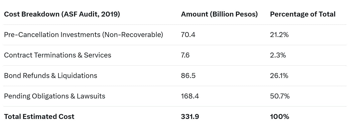The true price tag emerged slowly, like a hangover after a lavish fiesta. An initial government projection pegged cancellation at 100 billion pesos, touting savings by pivoting to the cheaper Felipe Ángeles International Airport (AIFA) in Santa Lucía. But a 2019 audit by Mexico's Superior Audit Office (ASF) shattered that illusion.