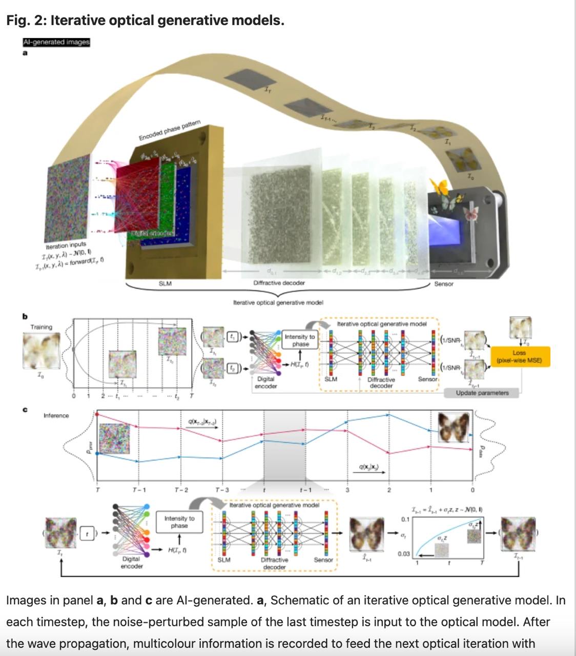 - Iterative OGM: the current sensor image is fed back digitally, slightly denoised, re-encoded onto the SLM, and light passes through the same diffractive decoder again — exactly mimicking digital diffusion’s iterative refinement, but with optical speed at each step.