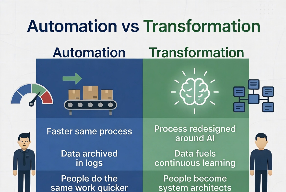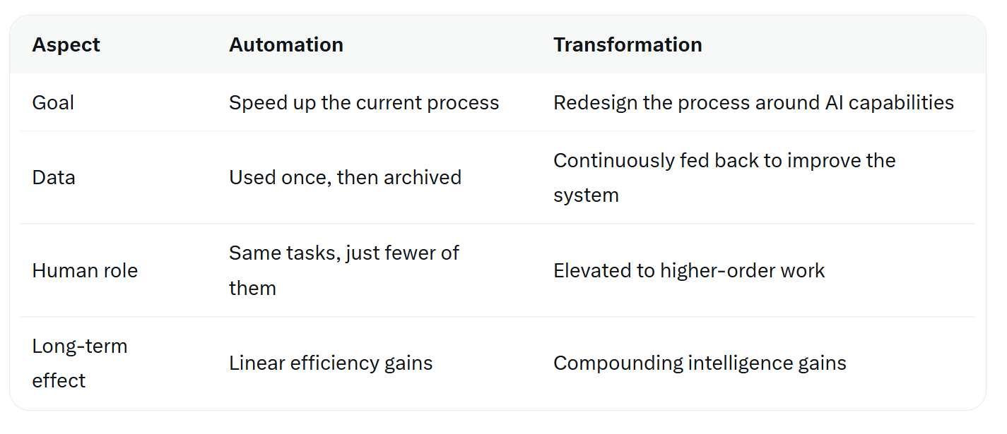 Automation takes an existing process and makes one piece of it faster or cheaper. Transformation asks a more radical question: What should this process look like when intelligence is native to every step?