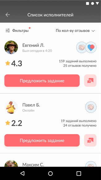 В списке исполнителей найдите конкретного, нужного вам пользователя, или исполнителя, чей профиль и опыт вам понравятся. При необходимости можно воспользоваться сортировкой и фильтрацией исполнителей из списка.