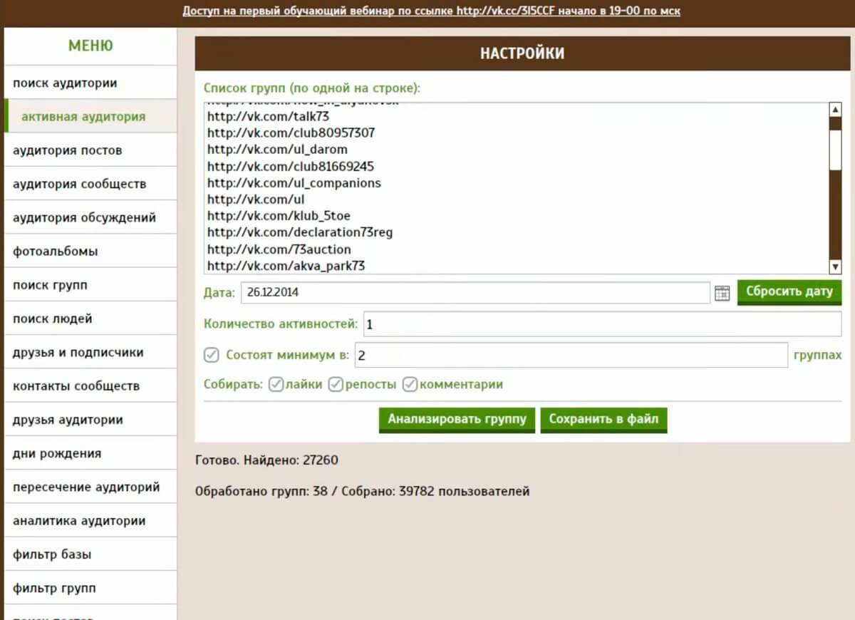 Церебро.рф — Церебро Таргет – самый известный и эффективный инструмент для парсинга ЦА в Вк. Платный, но имеет множество функций.