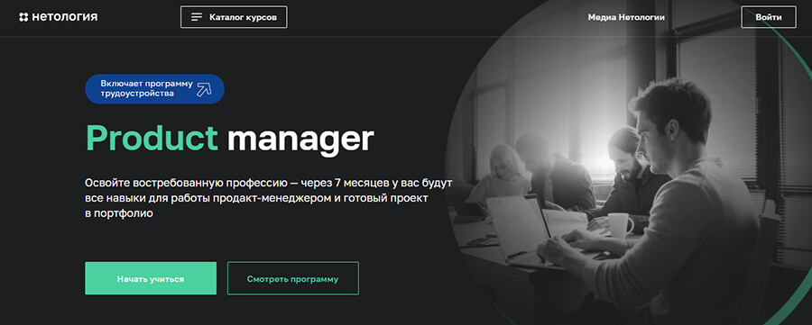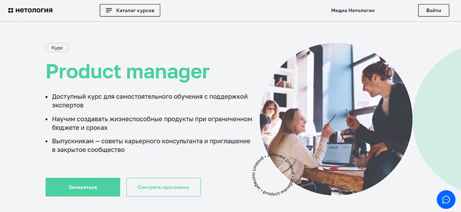 Курс «Product manager» от Нетологии позволяет за 7-10 месяцев очного или онлайн-обучения с нуля освоить работу продакт-менеджера. Главный упор делается на практику, в процессе которой все студенты работают с несколькими продуктами. На курсе научитесь создавать продукты и находить способы их улучшения.