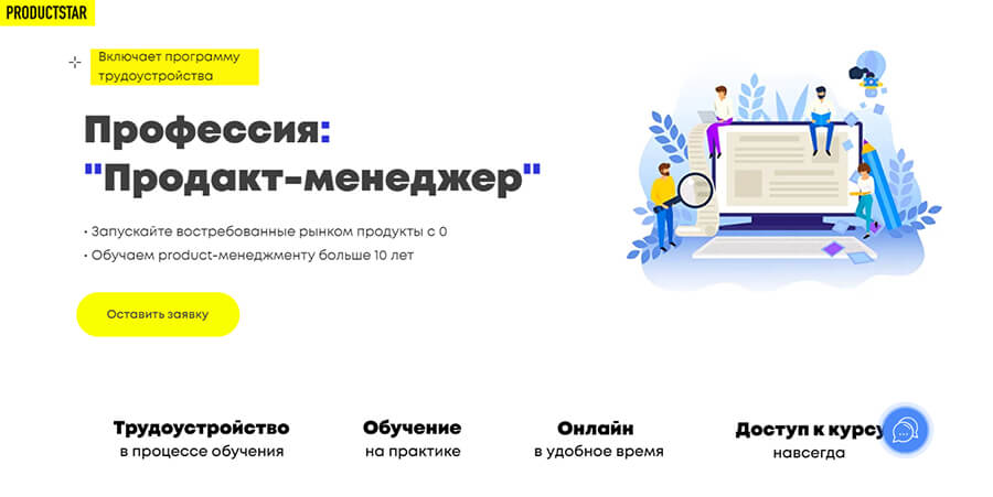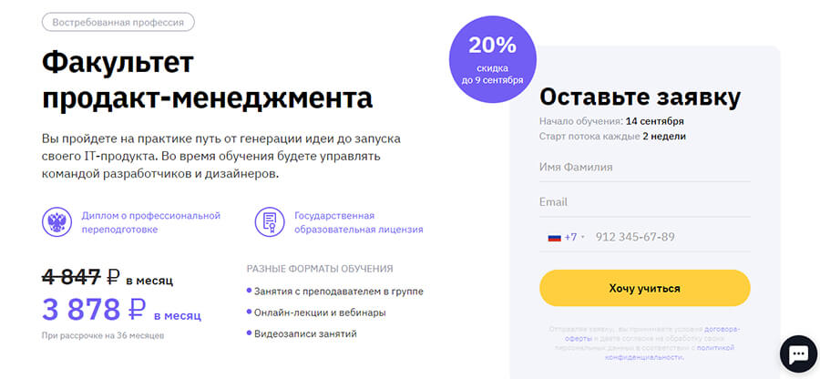 Онлайн-университет позволяет с нуля освоить профессию. Во время обучения на продакт-менеджера вы сможете совместно с дизайнером и командой разработчиков создать свой первый продукт. Благодаря приобретенным знаниям и практике, выпускники факультета способны успешно конкурировать с опытными специалистами. Им гарантируется трудоустройство.