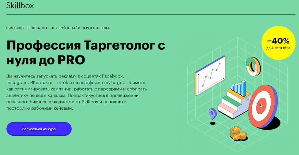 Комплексный курс по таргетингу от нуля до профи в школе Skillbox с реальным трудоустройством и первыми проектами через 4 месяца. Ученики получают по 3 000 рублей для продвижения бизнеса на каждой рекламной площадке во время обучения.