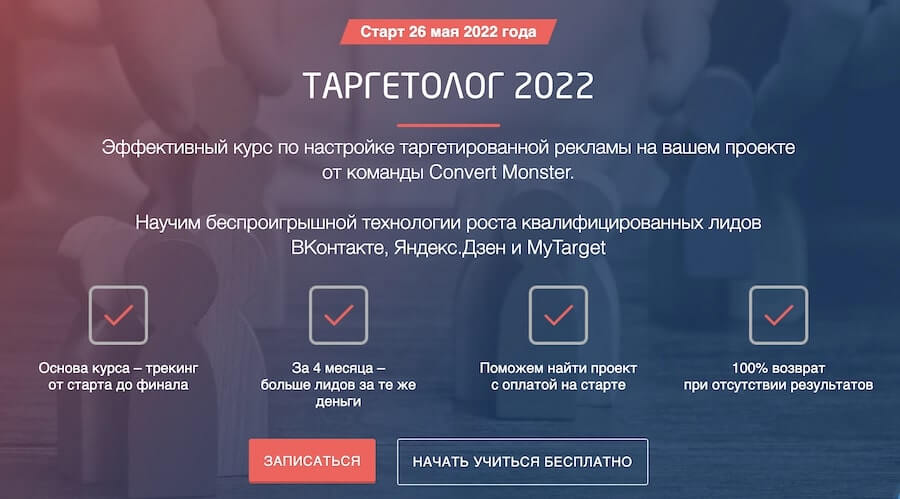 Курс от обучающего центра интернет-маркетинга Convert Monster. Новая программа «Таргетолог 2022» даст полное понимание функционала и возможностей Вконтакте, MyTarget, Яндекс.Дзен от создания рекламного кабинета до запуска кампаний и аналитики. Можно помотреть 6 уроков на выбор бесплатно.