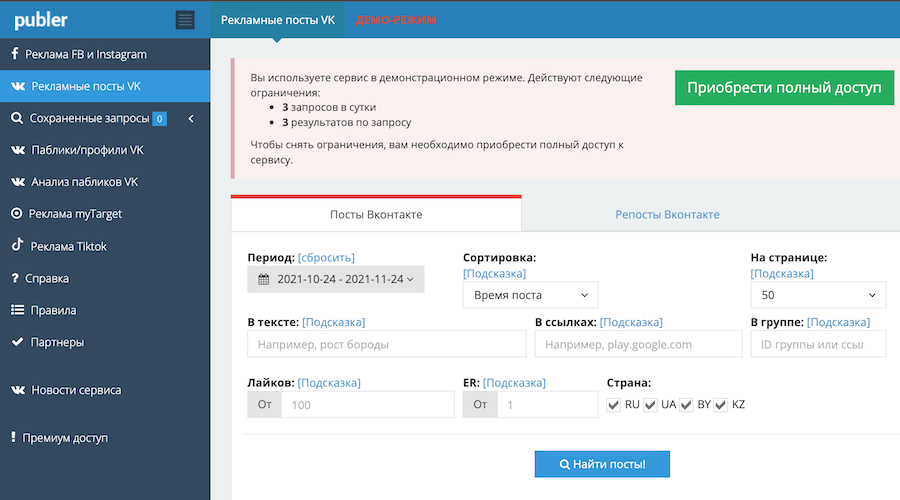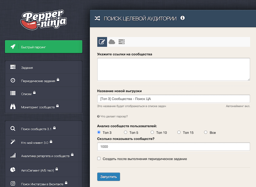 С базовым бесплатным доступом можно собрать аудиторию по основным параметрам, спарсить сообщества, активных и новых подписчиков (только с ограничением по объему расчетов).