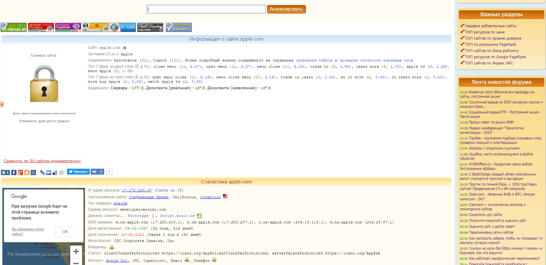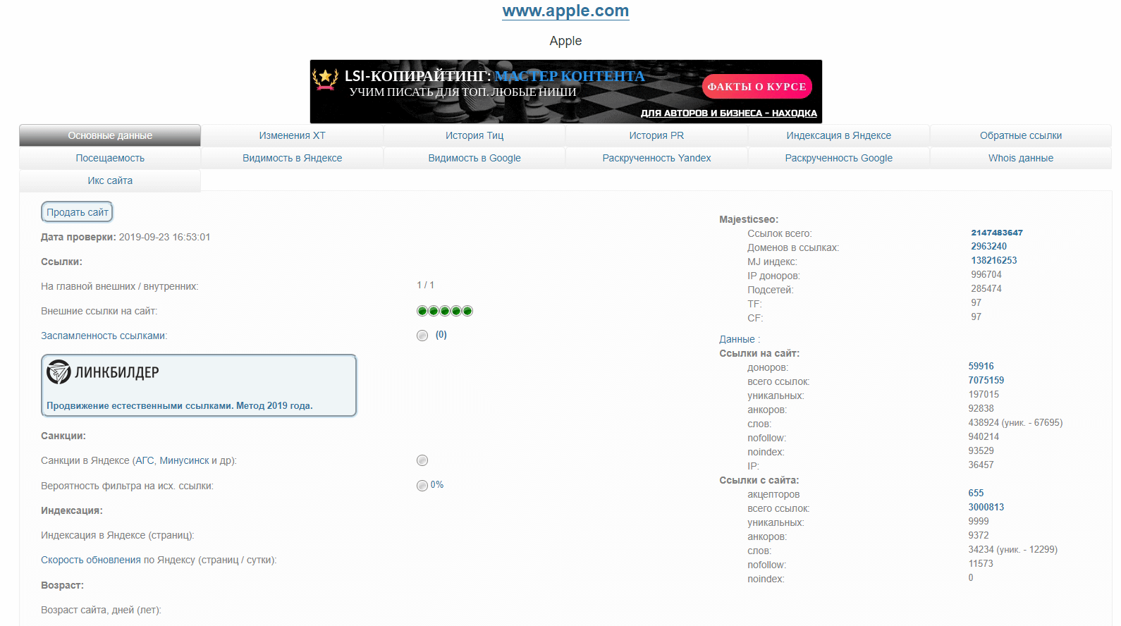 - Поисковые системы: показ ключевых параметров ресурса (ИКС, PR), число страниц в индексе Яндекс и Google, присутствие в каталогах, возможные фильтры, проверка на наличие вирусов.