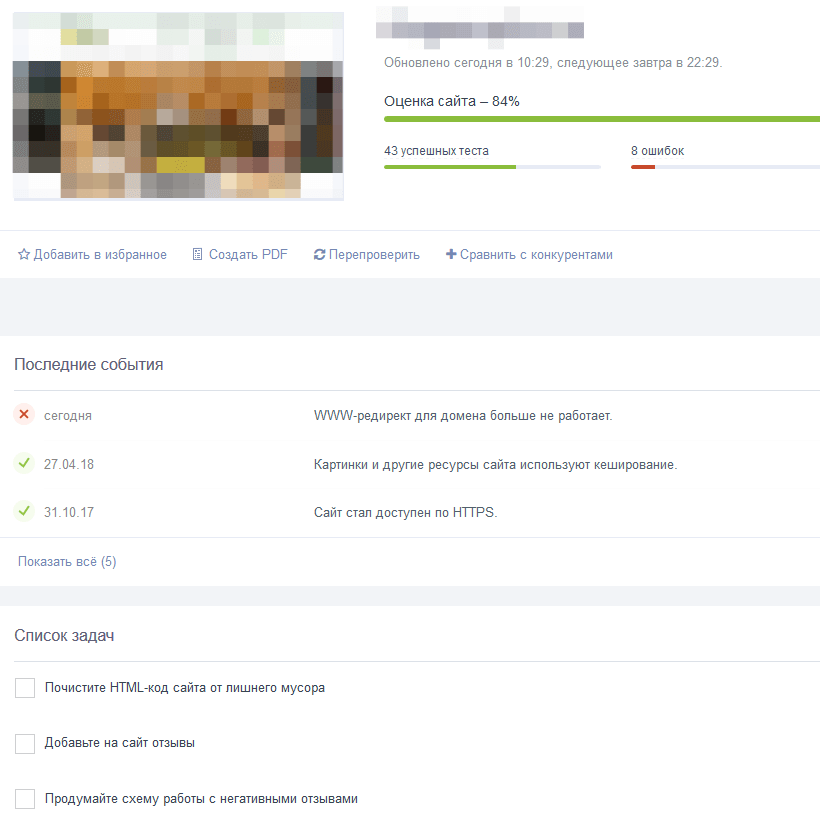 Количество ежедневных бесплатных проверок ограничивается 9 сайтами, чего вполне достаточно для анализа собственного проекта и нескольких конкурирующих.