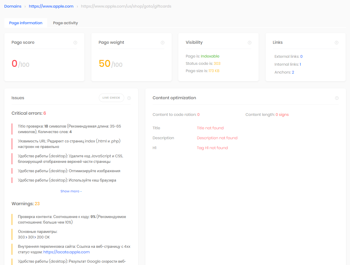 - Общая информация: редиректы, наличие HTTPS и так далее + рекомендации по устранению ошибок.
