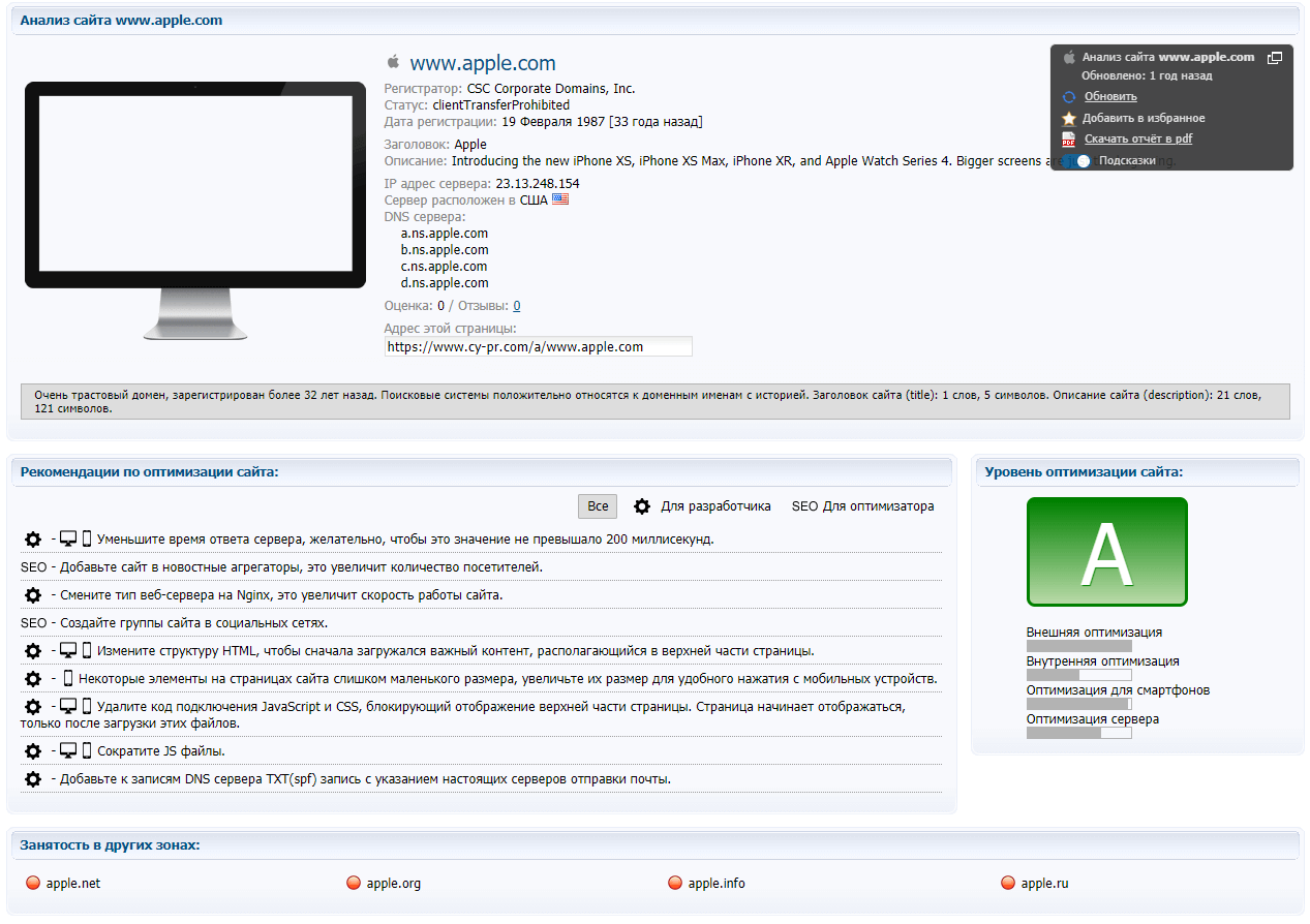 - Производительность и рекомендации по улучшению быстродействия (включение сжатия, использованию кэша в браузере и так далее).