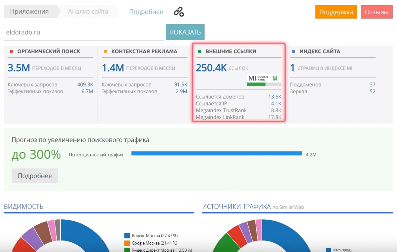 Из очевидных плюсов можно отметить наличие встроенного агрегатора данных из баз других сервисов. Присутствует и собственный алгоритм комплексной оценки качества сайта.