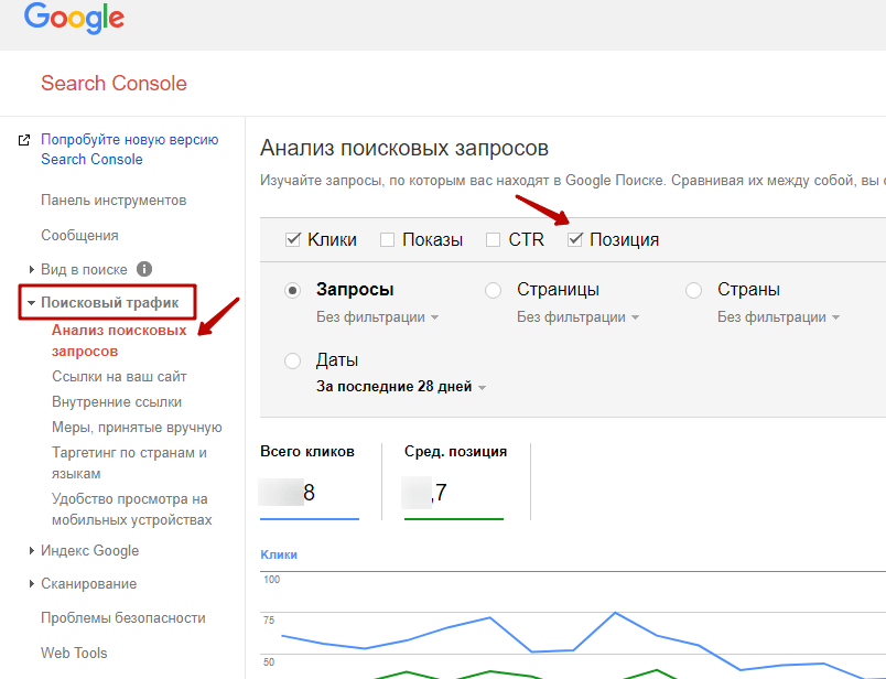 Или вебмастер Гугла. С помощью этого инструмента можно увидеть количество показов, CTR, количество кликов и позицию.