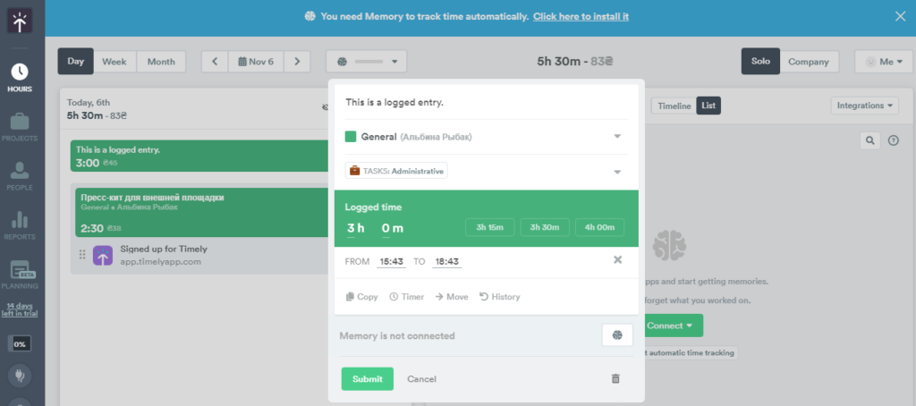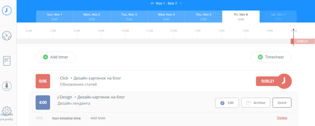 Hours поддерживает функцию «Timeline», которая позволяет следить за графиком выполнения заданий и заполнять пробелы в расписании: