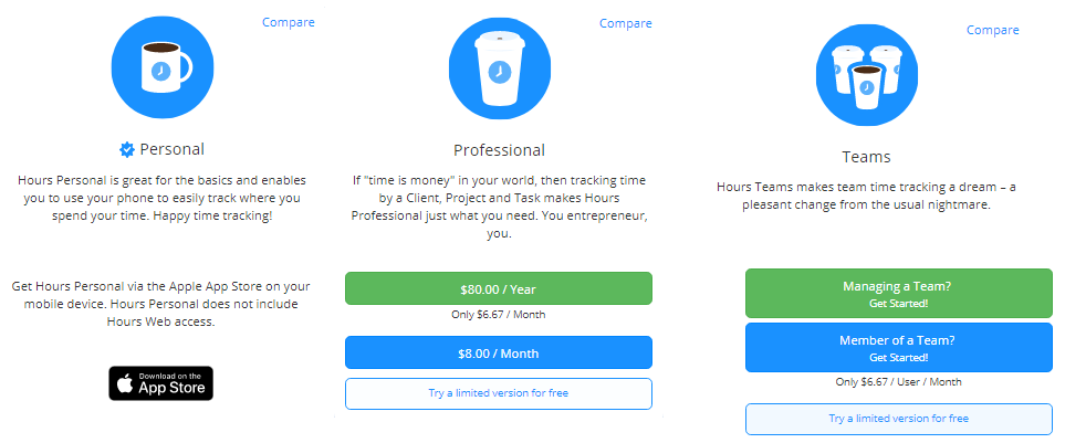 Тайм-трекером Hours можно пользоваться бесплатно в личных целях. Для этого надо выбрать тарифный план «Personal». Он позволяет подключить одного участника и использовать таймер без ограничений.