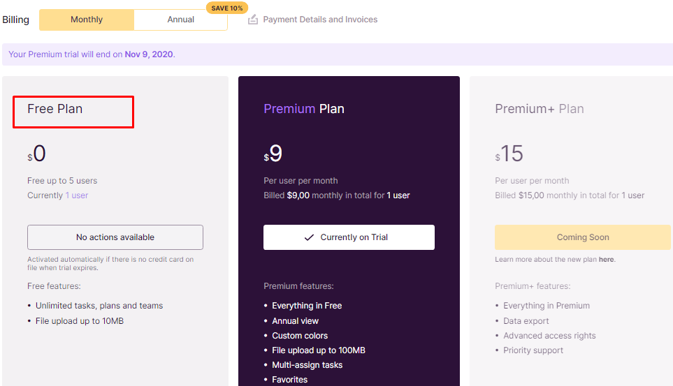 Подключение премиального плана стоит 9 дол. США в месяц на одного участника. В стоимость пакета входит годовая отчетность, загрузка файлов весом до 100 Mб, возможность выделения фаворитов и подключения неограниченного количества участников проекта.