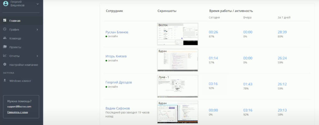 На главной странице Monitask отображает всех участников проекта и их активность в течение дня. Под именем каждого сотрудника указывается статус: «онлайн», «последний раз заходил 19 часов назад» и т. д. Напротив каждого работника — скриншот с его экрана. В платной версии Monitask делает 30 скриншотов в час.