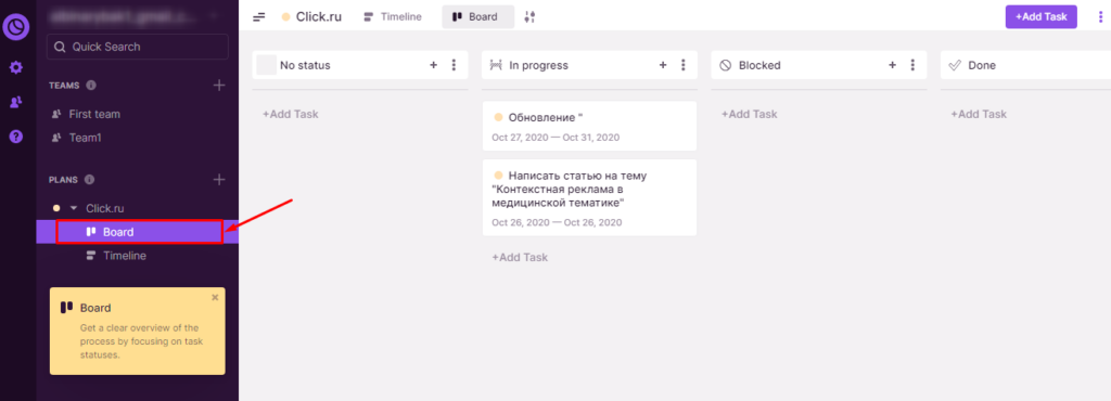 Вся информация о текущих и выполненных проектах отображается на доске заданий: