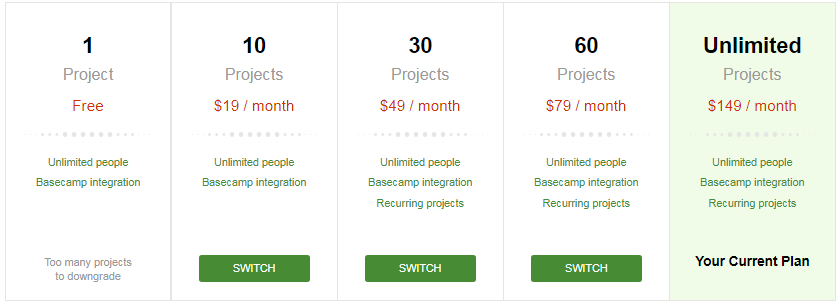 Бесплатный тестовый период — 30 дней. Далее бесплатно можно подключить один проект. Доступна интеграция с Basecamp.