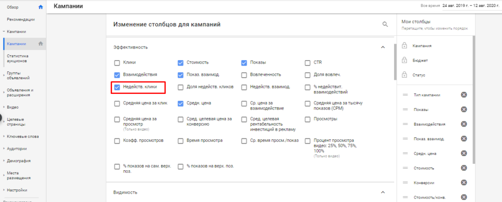 - Кликните на знак «Столбец» над отчетной таблицей. В разделе «Эффективность» отметьте пункт «Недействительные клики».