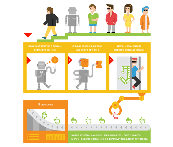 - Онлайн-проверка на базе машинного обучения. Онлайн-фильтрация работает на базе технологии машинного обучения Матрикснет. Алгоритм анализирует каждый клик и сверяется со списком, состоящим из 250 характеристик. Яндекс не раскрывает факторы, которые используются для оценки качества трафика, чтобы защититься от мошенников.