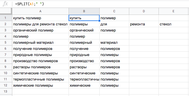 Пример. Мы выгрузили маски слов из Wordstat. Теперь нужно найти минус-слова. Ускорить работу поможет функция SPLIT.