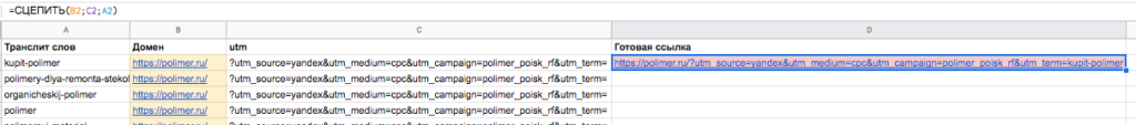 Применим функцию СЦЕПИТЬ — объединим для каждого ключевого слова в столбце URL посадочной страницы, UTM-метки и слово в транслитерации в качестве параметра utm_term.