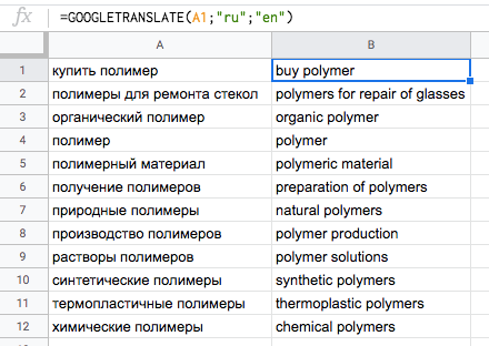Для перевода в соседнем с ключевыми словами столбце пропишем формулу: