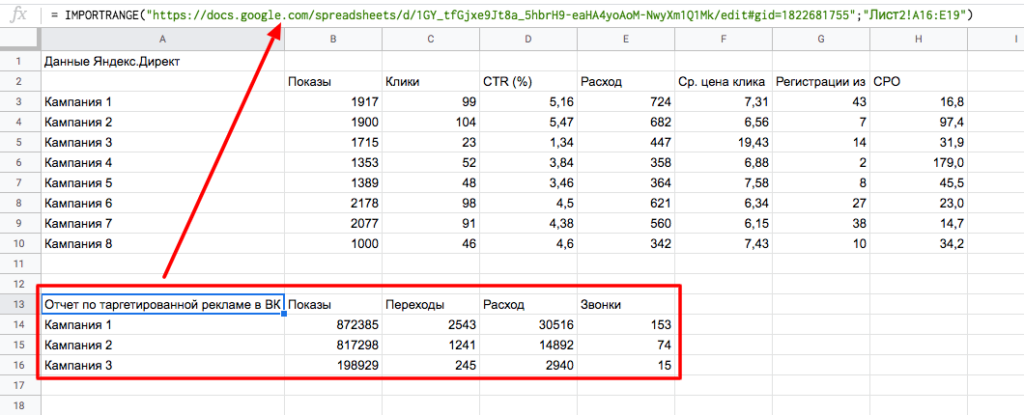Пример. Создадим отчет, в котором соберем статистику по контекстной и таргетированной рекламе. Данные нам предоставляют разные специалисты. Чтобы все это объединить на одном листе, используем функцию IMPORTRANGE.