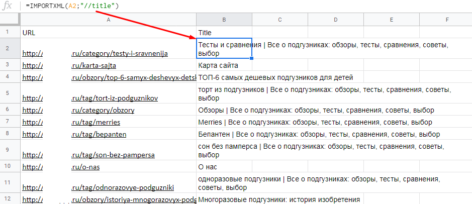 Пример. Нам нужно проверить, заполнены ли теги title на страницах сайта. Вводим в первом столбце URL страниц, которые нужно проверить, а в соседнем — формулу IMPORTXML. Xpath-запрос для парсинга title выглядит так: "//title".