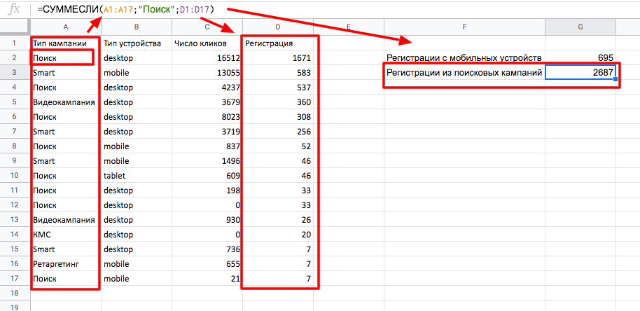 Пример. Мы выгрузили отчет из Google Analytics с разбивкой по типам кампаний и типам устройств. Нам нужно быстро подсчитать сумму регистраций с мобильных устройств и поисковых кампаний.