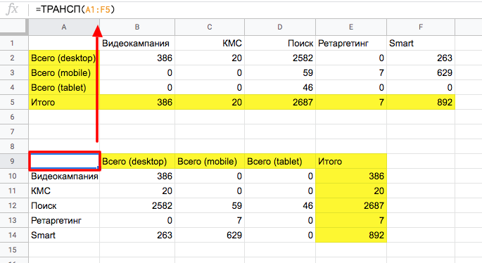 В свободную ячейку прописываем =ТРАНСП и указываем диапазон — в нашем примере это A1:F5.
