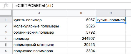 Пример. Есть список ключевых слов для сайта по продаже полимеров и полимерного сырья, которые были собраны из разных источников. В них удалили лишние символы, но остались пробелы. Их легко убрать.