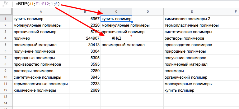 Пример 1. Выгружены ключевые слова из Яндекс.Директа и ключевые слова из кампании в Google Ads. Нам нужно определить, каких слов, которые есть в Google Ads (столбец А), нет в Директе (столбец Е).