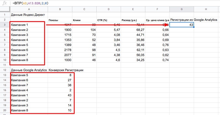 Пример 2. Нужно свести два разных отчета. В одном выгружена статистика по кампаниям из Яндекс.Директа, во втором — данные по конверсиям из Google Analytics.