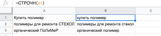 Пример. При сборе семантического ядра в список попали слова в разном регистре. Чтобы привести список слов к единому формату, воспользуемся функцией СТРОЧН.