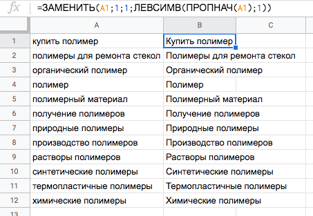 Пример. Подготовим из загруженного списка ключевых слов релевантные заголовки. Заголовки должны начинаться с заглавной буквы, поэтому применим к ключевым словам функцию ЗАМЕНИТЬ.