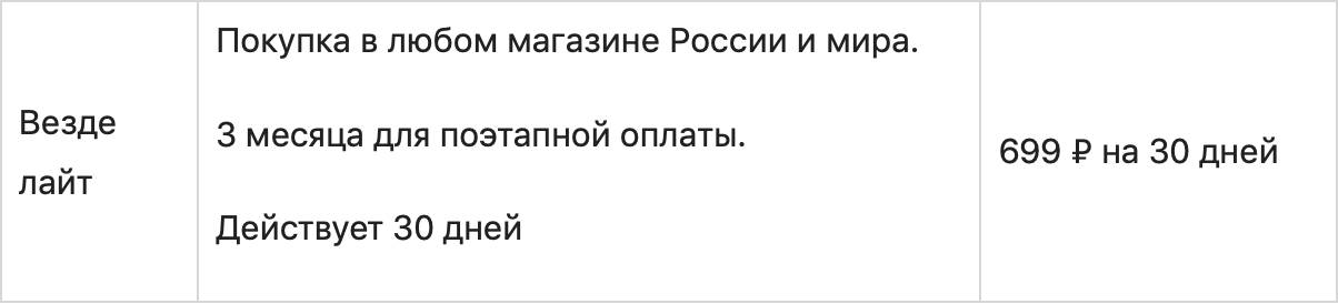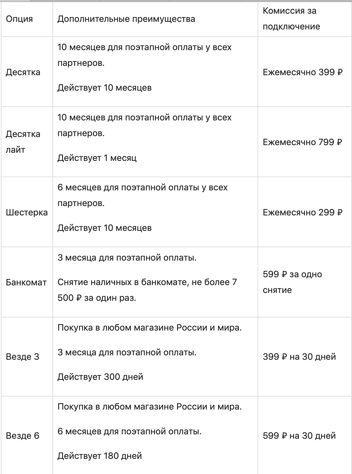Можно подключить опцию “Везде” и расплачиваться с отсрочкой платежа абсолютно в любой торговой точке не только в России, но и за рубежом. Но услуга эта платная.