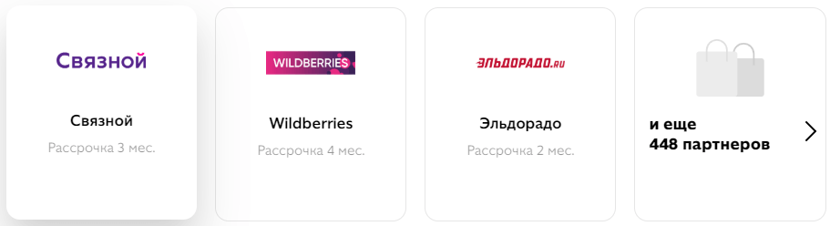 Рассрочка действует на оплату в магазинах-партнерах банка, которых более 50 000. На самом деле это количество торговых точек, при этом один партнер может владеть несколькими десятками или сотнями магазинов. Точное число партнеров – 451.