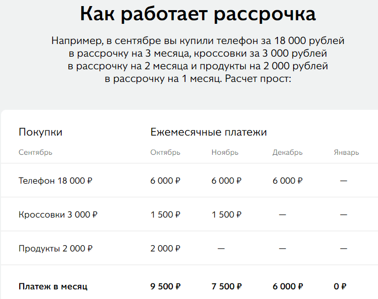 - Цена товара или услуги делится на количество месяцев рассрочки (конкретный период зависит от условий магазина).