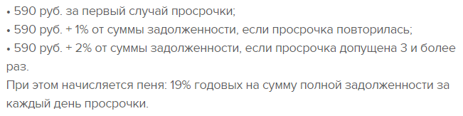 - Штраф за пропуск ежемесячного платежа – 699 руб. Неустойка за неплатежи – 10 %.