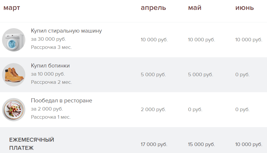 - Если клиент воспользовался рассрочкой у партнеров банка, в следующем расчетном периоде погашается часть долга (стоимость товара, деленная на количество месяцев льготного периода).
