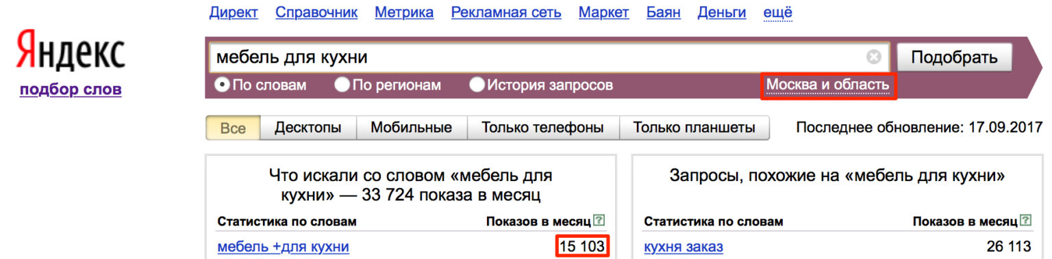 Значение знаменателя для Яндекс.Директ легко найти в сервисе Wordstat, указав нужные регионы поиска.