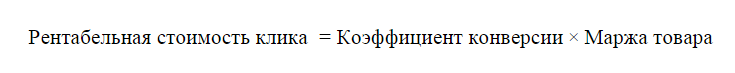 Обратите внимание, что используется не цена товара, а именно его маржа (разница между себестоимостью и отпускной ценой). Стоимость клика может быть меньше цены, но, если в сумме с остальными затратами на производство/приобретение продукта она её превысит, получится торговля в убыток.