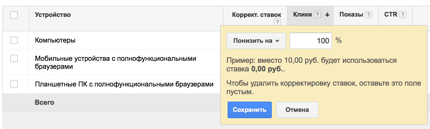 Размещая рекламу в Google AdWords, не забудьте о понижающей корректировке ставок для ПК в настройках каждой группы объявлений (или кампании, если вся она рассчитана на мобайл). Установите ее на уровне 100%, чтобы объявления не отображались на десктопах: