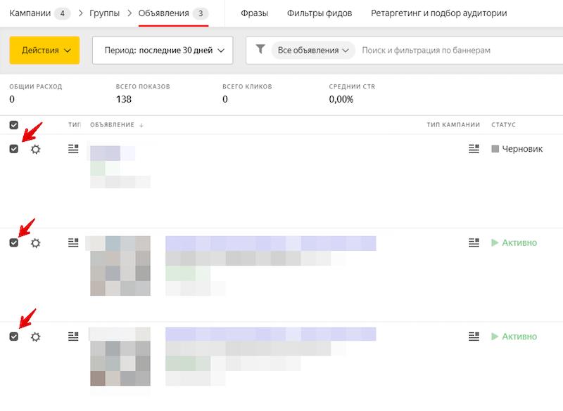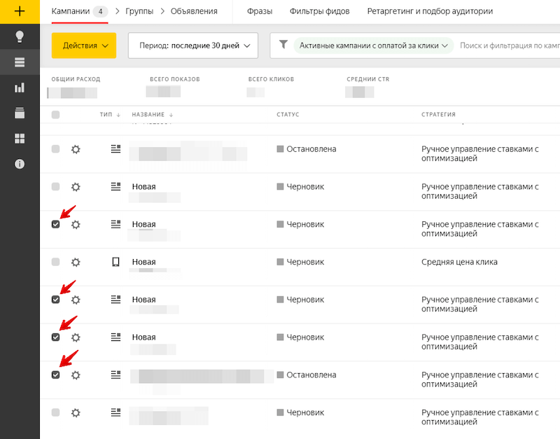 С помощью инструментов массового редактирования в новом интерфейсе Директа можно добавить быстрые ссылки сразу в несколько (до 50) объявлений. Для этого: