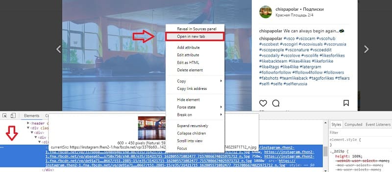 Возвращаемся к экрану, и наводим мышкой на фотографию, и когда она подсветиться — кликаем на неё. После этого внизу, в появившейся плашке появится код с этой фотографией. Находим изображение, снова жмём правой кнопкой мыши и выбираем «Open link in new tab».