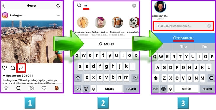 Практически то же самое, что и при отправке на почту, с той лишь разницей, что пост с понравившейся картинкой мы отправляем себе в личные сообщения Инстаграма или в мессенджер.