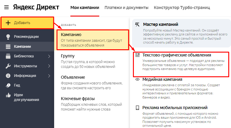 Для настройки рекламы в РСЯ создайте текстово-графические объявления: