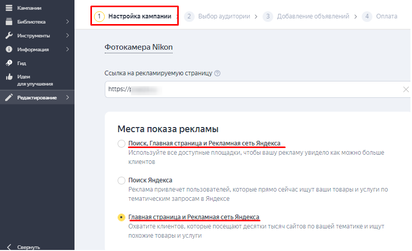 После добавления цели приступите к настройкам в Яндекс.Директе. На этапе настройки кампании укажите место показа: на поиске, в РСЯ и на Главной странице.